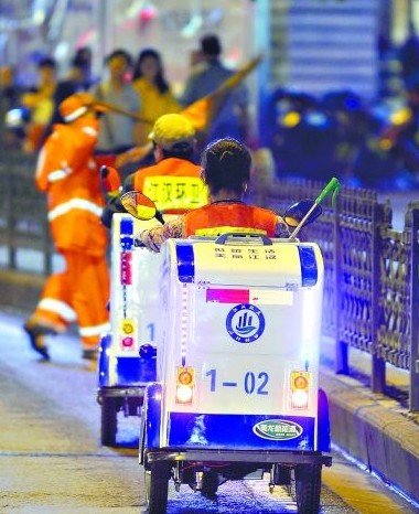 近幾日晚上,江漢城管清掃一隊環(huán)衛(wèi)工朱師傅都騎著電瓶車,在大洋百貨廣場撿拾廢棄物。車還是那輛車,但尾部多了兩豎條共20個彩燈在閃爍。